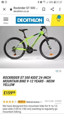 These get excellent reviews online 417/5 and are £ new at Decathlon Mountain bike for 9 to 12yearolds (135 to 150 cm) wanting to regularly go mountain biking. BTWIN Rockrider ST 500 Kids' Inch Mountain Bike Ages 69 Neon Yellow Reference. Rockrider ST 500 Kids' 24Inch Mountain Bike 912 Years Neon Yellow Reference ₪ More colors Size Unique Size 24" Quantity NOTIFY ME Add to cart There are not enough products in stock Last items in stock BUYINSTORE;.